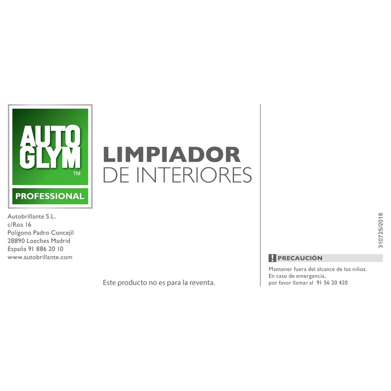 Etiqueta descriptiva del Limpiador de interiores con información de seguridad. ideada para la prevención de riesgos laborales (PRL).