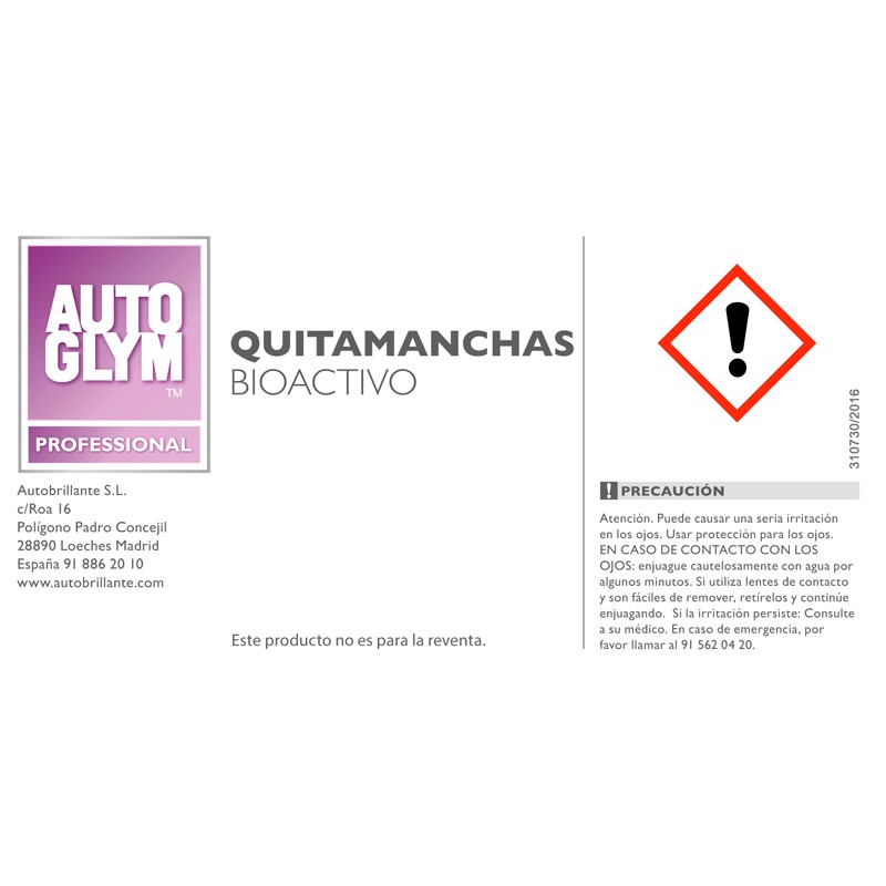 Etiqueta descriptiva del Quitamanchas bioactivo con información de seguridad. ideada para la prevención de riesgos laborales (PRL).