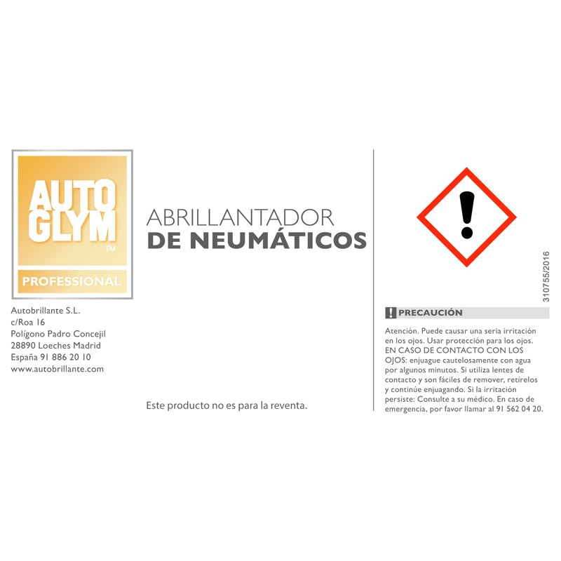 Etiqueta descriptiva del Abrillantador de Neumáticos con información de seguridad. ideada para la prevención de riesgos laborales (PRL).
